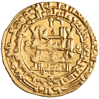 Great Seljuq: Tughril Beg (1038-1063), gold dinar (4.64g), Aydhaj (Izeh) mint, AH 447 (1055-1056 CE). Seljuq emblem bow and arrow in both upper fields, resembling a mosque's dome and minaret. Citing Abbasid caliph al-Qa'im. Ruler cited as "al-sultan al-m