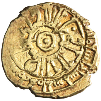Sicily: William I (1154-1166), gold tari (1.48g), Siqiliya (Sicily), 1154-1166 CE. William cited with title al-Hadi. Pellet in obverse center, inner margin "al-hadi bi-amrillah al-malik ghulyalim" (the one who guides by the command of Allah, the King William), Arabic legend in outer margin / Cross flanked by IC-XC NI-KA in reverse center, Arabic legends around.