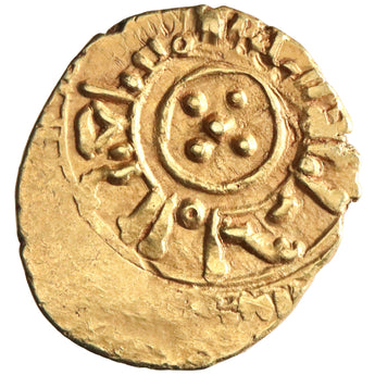 Sicily: William II (1166-1189), gold tari (1.06g), Messina, 1166-1189 CE. William cited with title al-Musta'izz. 5 pellets in the shape of a cross in obverse center, inner margin "al-malik ghulyalim al-thani al-musta'izz" (the King William the Second, the one who seeks glory), Arabic legend in outer margin / Cross flanked by IC-XC NI-KA in reverse center, Arabic legends around.