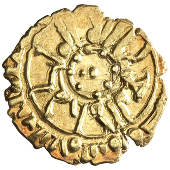 Sicily: Roger II (1105-1154), gold tari (0.86g), Siqiliya (Sicily), 1105-1154 CE. Roger cited with title al-Mu'tazz. Pellets in obverse center, inner margin "al-mu'tazz billah al-malik rujar" (the one who is glorified by Allah, the King Roger), Arabic legends in outer margin / Cross flanked by IC-XC NI-KA in reverse center, Arabic legends around.