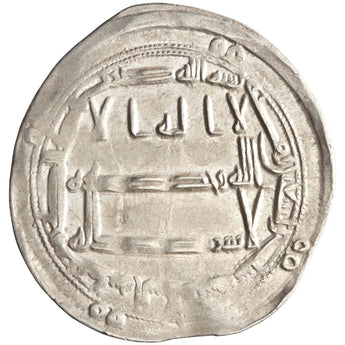 Abbasid: al-Amin (809-813), silver dirham (2.90g), Madinat al-Salam (Baghdad) mint, AH 196 (811-812 CE). Very rare variety citing al-Amin in lower reverse. Phrase "rabbi Allah" in upper reverse.