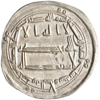 Abbasid: al-Amin (809-813), silver dirham (2.90g), Madinat al-Salam (Baghdad) mint, AH 196 (811-812 CE). Very rare variety citing al-Amin in lower reverse. Phrase "rabbi Allah" in upper reverse.
